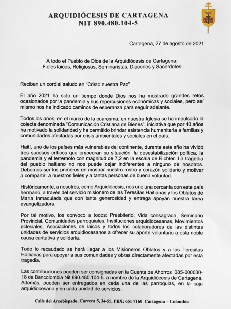 Cartagena, 27 de agosto de 2021 A todo el Pueblo de Dios de la Arquidiócesis de Cartagena: Fieles laicos, Religiosos, Seminaristas, Diáconos y Sacerdotes Reciban un cordial saludo en “Cristo nuestra Paz” El año 2021 ha sido un tiempo donde Dios nos ha mostrado grandes retos ocasionados por la pandemia y sus repercusiones económicas y […]