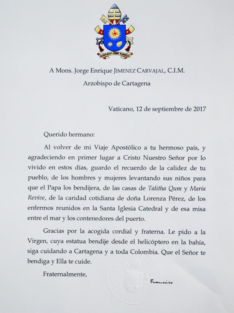 Gracias por la acogida cordial y fraterna. Le pido a la Virgen, cuya estatua bendije desde el helicóptero en la bahía, siga cuidando a Cartagena y a toda Colombia. Que el Señor te bendiga y Ella te cuide.