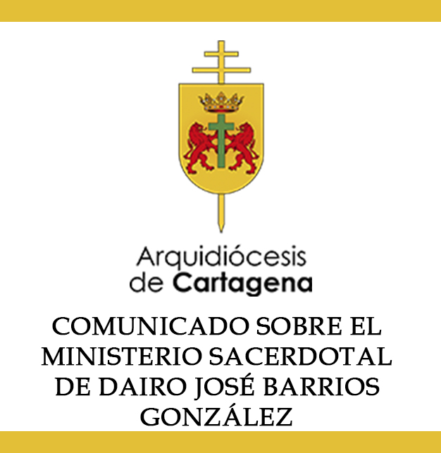 COMUNICADO SOBRE EL MINISTERIO SACERDOTAL DE DAIRO JOSÉ BARRIOS GONZÁLEZ LA ARQUIDIOCESIS DE CARTAGENA COMUNICA: Que el sacerdote Dairo José Barrios González ordenado el día 16 de Abril de 2005 para la Arquidiócesis de Cartagena, cuyo último cargo eclesiástico al que renunció en Septiembre 18 de 2015 fue el de Cura Párroco de la Parroquia […]