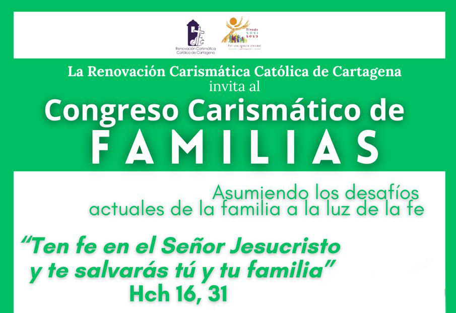 ¿Cómo asumir los desafíos actuales de la familia a la luz de la fe? La Renovación Carismática Católica de Cartagena invita a participar en el Congreso Carismático de Familias, un espacio de reflexión, oración y reconciliación familiar, los días 16 y 17 de septiembre La Renovación Carismática Católica de Cartagena invita a todas las familias, […]