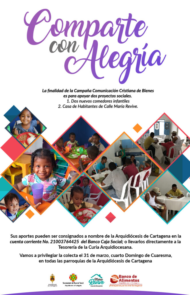Junto con mi cordial y fraternal saludo, en el inicio de la Cuaresma 2019, como lo hacemos todos los años, estamos convocando la Campaña de Comunicación Cristiana de Bienes (CCCB) -2019 en la Arquidiócesis de Cartagena. El lema con el cual se animará la Campaña es “Comparte con Alegría”. La finalidad es muy concreta, tiene como objetivo las múltiples necesidades de los pobres y personas más vulnerables de nuestro país. Con nuestras obras manifestamos el amor a Dios y a nuestros hermanos los pobres.