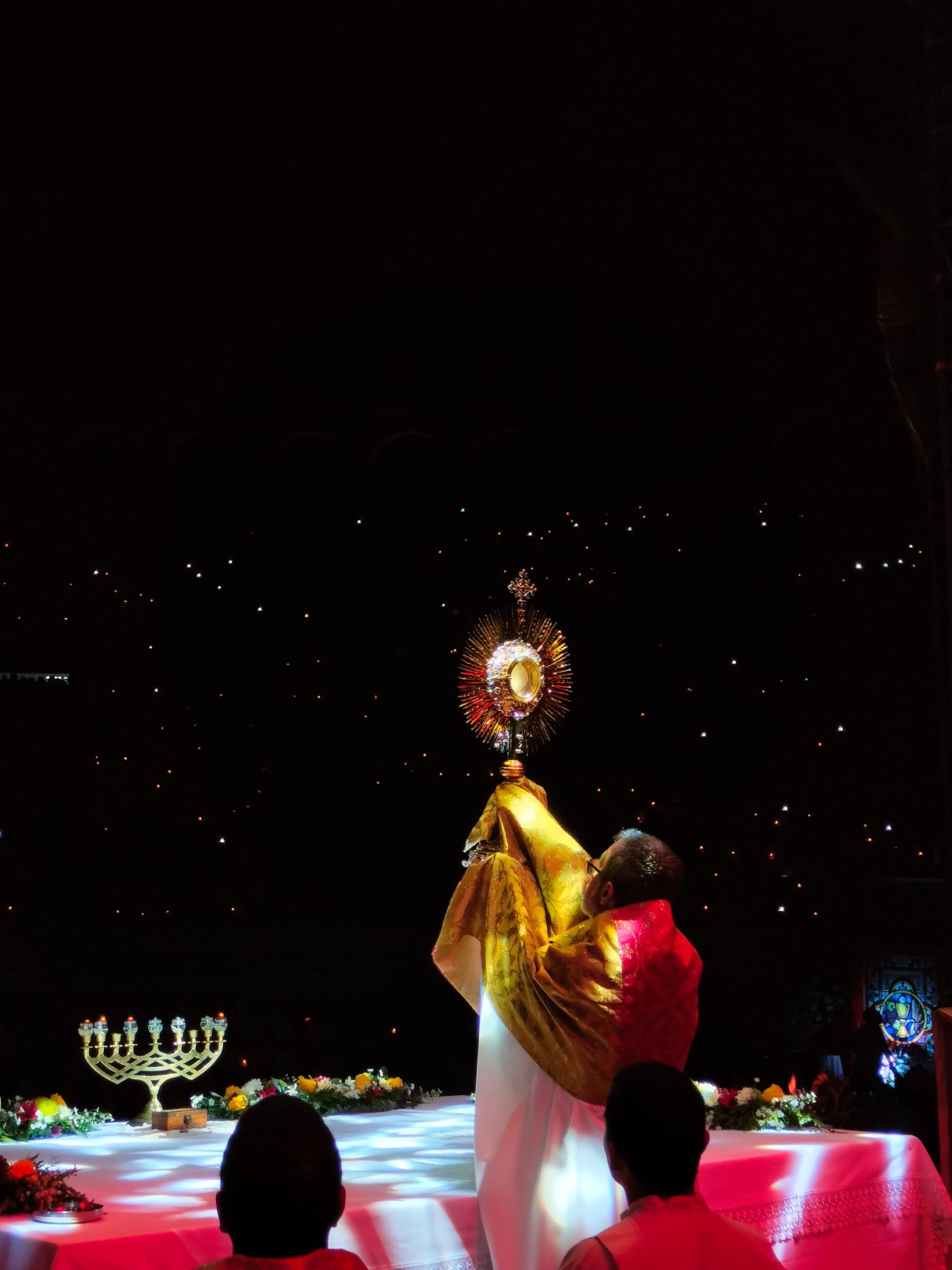 La procesión eucarística final, acompañada por velas encendidas y cantos de adoración, recorrió los cuatro altares preparados por distintas comunidades, cada uno con un mensaje de fe y vida: el amor de Dios, la salvación en Cristo, el llamado a vivir con sentido y la acción del Espíritu Santo en la historia.