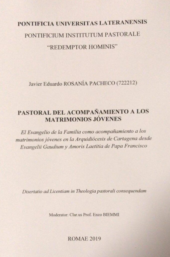 Hace ya casi dos años que vino el Papa Francisco a Colombia. El tiempo vuela. Testigo de ello es uno de los sacerdotes de nuestra Arquidiócesis: el padre Javier Eduardo Rosanía Pacheco. Al terminar la visita del Sumo Pontífice, de la que él fue coordinador general en Cartagena, el padre Javier se trasladó a Roma para licenciarse en Teología Pastoral. Pasaron dos años y el padre Javier ya se graduó: ¡Tenemos un nuevo Licenciado en Teología Pastoral en la Arquidiócesis de Cartagena!