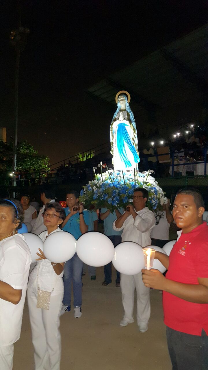 3d3dA las 8:30 pm se recibió la imagen de la Virgen María quien mientras era paseada por todo el estadio entre canciones y velas encendidas, se les rindió homenaje con los gozos que fueron contestados por todos los asistentes al lugar.